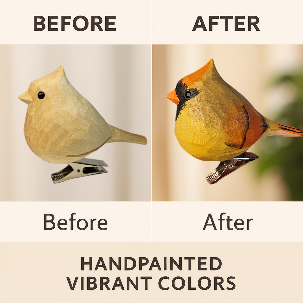 Celebrate the quiet beauty of the female Cardinal with this handcrafted clip‑on ornament. Carved from natural wood and hand‑painted in warm golds and soft browns with a delicate orange crest and beak, this bird brings a natural touch to any holiday tree. The built‑in spring clip makes decorating effortless—just clip onto branches, wreaths, garlands, or gift wrap. Durable, feather‑light, and gift‑ready in a keepsake box, it pairs perfectly with our Male Cardinal for a charming couple set.